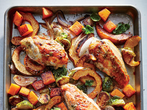 Maple-Mustard Roasted Chicken with Squash and Brussels Sprouts