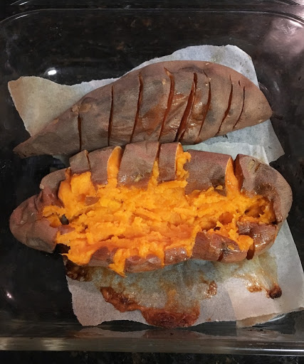 Line a baking pan with parchment paper, and set aside. Start with thin, evenly shaped sweet potatoes. Slice the knife into each sweet potato 8-10 times per potato, going about a third of the way down with each cut. Place potatoes in the pan, then place the pan on the oven center rack. Now turn the oven on to 450 F. Bake 30 minutes, then turn (unless they are very small, they’re probably not done yet) and continue to bake until sweet potatoes are soft and you can see that some of the natural sugars have spread onto the parchment paper (see photo). This means the potatoes are starting to caramelize. Sweet potatoes can be served immediately, or you can refrigerate or even freeze for a later date. Serving suggestions are listed in the post – my favorite way to eat roasted sweet potatoes is covered with tahini.