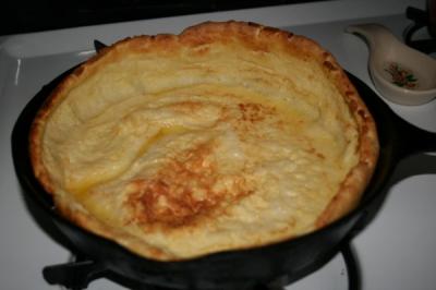 Melt 4 T butter in ovenproof dish or skillet. Mix 2 eggs, ½ C flour and ½ C milk together in small bowl. Pour into skillet and bake at 425 for 15-20 minutes. Puffs up beautifully. Drizzle with syrup or your own toppings.