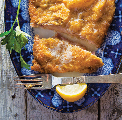 Season cutlets with salt and pepper. Place ham and cheese on one cutlet, leaving a ½" border along edge; place other cutlet on top; set aside. Place flour, egg, and bread crumbs in three separate shallow bowls. Dredge stuffed cutlet in flour, and coat in egg, then bread crumbs. Heat oil and butter in a 12" skillet over medium heat. Fry, flipping once, until golden brown and crisp, about 16 minutes. Serve with lemon wedges.