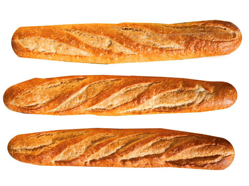 5-Uncover; remove towels, and flatten paper to space out loaves. Using a sharp razor or paring knife, slash the top of each baguette at a 30–degree angle in four spots (Figure D); each slash should be about 4″ long. Using the corner of the parchment paper as a guide, slide the loaves, still on the parchment paper, onto the baking stone. Place ice cubes in skillet (this produces steam that lets the loaves rise fully before a crust forms). Bake the baguettes until darkly browned and crisp, about 30 minutes; cool before serving.