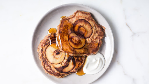 Heat a griddle or large nonstick skillet over medium; brush with oil. Place 2 apple slices in skillet, spacing about ½" apart, and cook until lightly golden, about 1 minute. Turn over and pour ⅓ cup batter over apples, spreading batter to cover. Cook pancake until bottom is golden brown and bubbles form on the surface, about 3 minutes. Flip and cook until cooked through and other side is golden brown, about 2 minutes. Transfer to a plate. Repeat with remaining apple slices and batter, brushing griddle with more oil as needed.