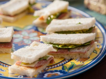 Layer half of the bread slices with the red peppers, salami, prosciutto, mortadella, cucumber slices, basil and pepperoncini. Top with the remaining bread slices. Using a serrated knife, cut away the crusts from each sandwich. Cut each sandwich into thirds. Place them on a tray and serve.