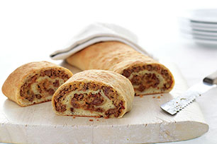 Unroll pizza dough onto baking sheet sprayed with cooking spray. Press into 15x8-inch rectangle; top with meat mixture. Roll up, starting at one long side. Rearrange if necessary so roll is seam side down.