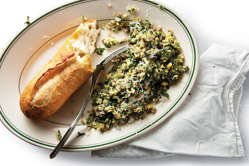 Heat oil in a 12" skillet over medium-high heat. Add garlic and onion; cook until soft, about 5 minutes. Add chuck; cook, stirring, until browned and all moisture evaporates, about 10 minutes. Add spinach; cook until heated through, about 2 minutes. Add eggs; cook until eggs are cooked and mixture is slightly dry, about 4 minutes. Season with salt and pepper; sprinkle with Parmesan. Serve with bread.