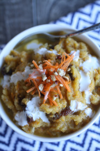 1. Combine all ingredients except raisins and chopped nuts in a saucepan and bring to a gentle simmer. Allow to simmer for 5-7 minutes until thickened. Using a hand-held blender process a couple of times to achieve an oatmeal- or porridge-like texture. Add raisins and simmer for another 1-2 minutes.