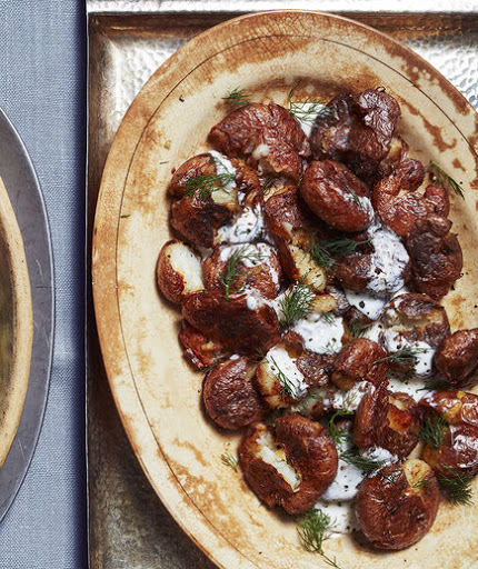 If you’ve never smashed potatoes before, this recipe is a great place to start. Waxy potatoes, like the baby red ones we use here, are best for smashing for a couple of reasons: unlike starchy potatoes (like russets) waxy potatoes won’t fall apart when you cook them or under the pressure of your fork. Boiling them whole in their red skins also helps preserve their shape and flavor. A simple mixture of crème fraiche and yogurt makes a delicious sauce for dipping and drizzling. With the addition of lemon zest and juice and a little bit of dill, it might just be our favorite new take on Ranch dressing.