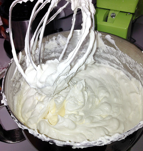 4-Going over to the mixer with the syrup, turn the speed to low. Quickly, pour a slow,steady stream of the syrup over the egg whites/sugar mixture being careful to not pour syrup on the side of the bowl or the whisk, is at will harden and not incorporate into the meringue. After syrup is added, turn mixer to med-high and let whip for 15 minutes until mixture has cooled to room temperature.