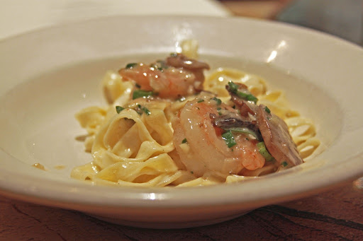 Serve creamy pasta topped with lemon butter shrimp and fresh grated romano.
