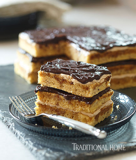 Building the Opera Cake: To assemble, place one Sponge Cake layer on serving plate. Brush with one-third of Coffee Syrup. Spread with half of Coffee Buttercream. Top with another cake layer; brush with one-third of syrup. Spread with half of Chocolate Ganache. Top with remaining cake layer; brush with remaining syrup. Spread with remaining buttercream. Chill at least 1 hour or until layers are firm. Casually spread top with remaining ganache. Using long sharp knife, trim sides of layers to make even. Makes 8 servings.