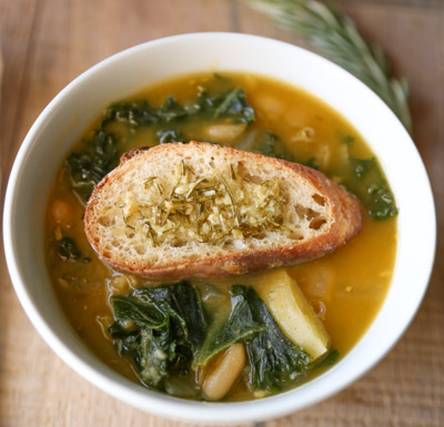 5. Add the kale to the soup and cook 5 more minutes. Remove from heat, salt & pepper to taste, then allow to rest for 5 minutes. Serve warm topped with crostini's.