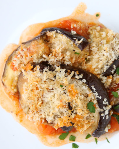 8. Place the panko mixture on top of the eggplant and bake uncovered for another 5 minutes. Or until the breadcrumbs are golden brown.
