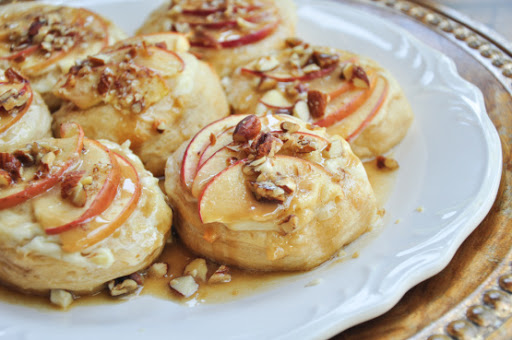 Peel and core apple; chop into smaller pieces. Spread cream cheese mixture evenly over biscuits. Top with chopped apples; sprinkle with pecans then drizzle