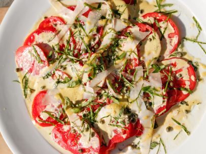 Pour a puddle of dressing in the middle of 4 dinner plates. Core the tomatoes and slice crosswise with a serrated knife about 3/8 inch thick. Arrange overlapping slices of tomatoes decoratively on the plates. Sprinkle with the fleur de sel and drizzle more dressing onto the tomatoes with a tablespoon. Sprinkle with the capers, basil, shaved Parmesan, and pepper. Serve at room temperature with a pitcher of extra dressing on the side.