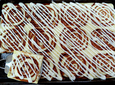 Preheat oven to 350°. Lightly grease an 11×17 inch jellyroll pan. In a large mixing bowl, beat together milk, butter and egg. Add sugar, then gradually beat the flour in. Carefully stir in the baking powder and salt. Pour batter into prepared pan. Squeeze out swirls of Cinnamon Roll Filling over pancake batter- 4 swirls across, 3 down, for 12 pancakes. I used wooden skewers laid across the pan as a guide. You can vary the size if you like. Bake in 350 degree oven for 8-9 minutes until center is set and does not give when pressed with your finger. Remove from oven and drizzle with Maple Cream Cheese Drizzle. Serve immediately. Makes 12 large pancakes.