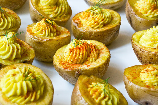 How adorable! Tender roasted potatoes are filled with a creamy egg mixture, then sprinkled with a little paprika and garnished with a sprig of dil. The perfect party appetizer!