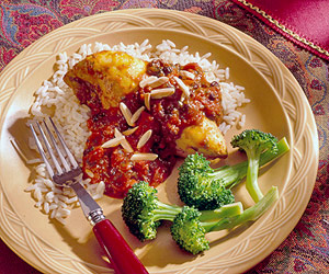 2. For sauce, skim fat from tomato mixture in skillet. In a small mixing bowl stir together cornstarch and cold water; add to skillet. Cook and stir until thickened and bubbly. Cook and stir for 2 minutes more. Serve chicken and sauce with rice. Sprinkle with almonds, if desired. Makes 6 servings.
