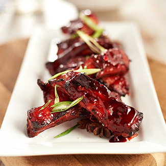 - In a mixing bowl, whisk together all of the ingredients, except the ribs and potstickers, to make a marinade.