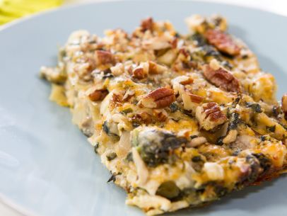 In a large bowl, combine the spinach, chicken, Cheddar, onion, cornstarch, salt, pepper, soy sauce, soup, sour cream, mushrooms and mayonnaise. Put a layer of noodles in the bottom of a greased 9-by-13-by-2-inch casserole dish. Spread half of the spinach mixture over the noodles. Put another layer of noodles over the mixture and cover with the remaining spinach mixture. Sprinkle the Parmesan over the casserole. Then sprinkle the pecans on top. Bake for 1 hour. Let the casserole sit for 15 minutes before serving.