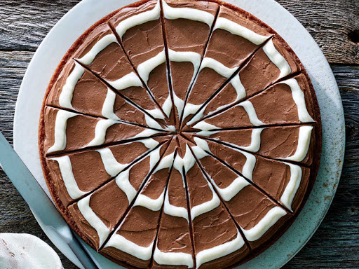 5. Place chocolate in a microwave-safe bowl; microwave at HIGH 30 seconds or just until melted, stirring occasionally. Stir melted chocolate into remaining cream cheese mixture. Pour chocolate mixture over blondies, spreading to an even layer. Snip a hole in 1 bottom corner of ziplock bag with cream cheese mixture. Pipe 3 concentric circles over blondies. Drag a wooden pick out from the center of the pan to the edge, repeating in a circle to create a web pattern. Cool.