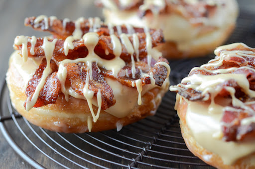Arrange candied bacon on top of donuts and drizzle the top with any remaining maple glaze. Serve immediately!