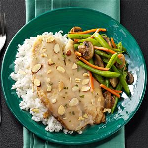 3. In the same skillet, melt remaining butter. Stir in remaining flour until smooth; gradually add the broth, wine and lemon juice. Bring to a boil; cook and stir for 2 minutes or until thickened. Stir in parsley. Serve fish and sauce with rice; garnish with almonds.