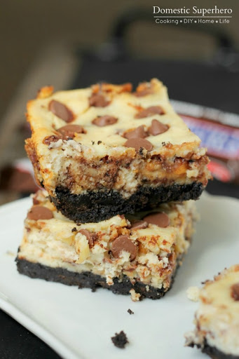 3. For the filling: Beat cream cheese, egg, sugar, and vanilla extract together with a hand or stand mixer until smooth and creamy, about 3 full minutes. Fold in the Snickers. Spread the mixture over your cooled crust. Top with chocolate chips.