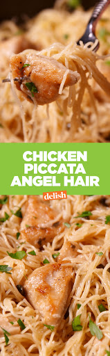 2. Reduce heat to low and add garlic and butter. Cook until fragrant. Add white wine, bring to a simmer and reduce slightly, about 1 minute. Add chicken stock, lemon juice, and capers. Bring to simmer and scrape the pan with the back of a wooden spoon to loosen the cooked chicken bits. Stir in heavy cream, if using. Return chicken to pan and add cooked angel hair. Add grated Parmesan and toss until pasta is coated in sauce.