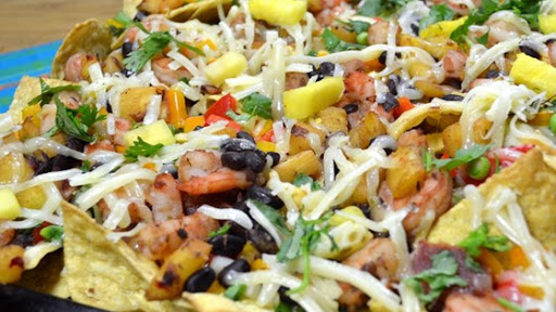 Layer the chips on a tray or cookie sheet. Arrange the red pepper, orange pepper, onion, avocado, and pineapple on top of the chips.