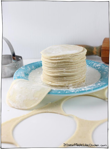 3. Take about ½ of the dough and roll out as thinly as possible. Alternatively, if you have a pasta machine, dust a small piece of dough with cornstarch, and roll out thinly. Use a large circle cookie cutter to make round wrappers, twisting the cookie cutter to cut all the way through. Or you can use a knife to cut square wrappers. Lightly dust and rub each wrapper with a bit of cornstarch so that they don’t stick together. Repeat with the other half of the dough.