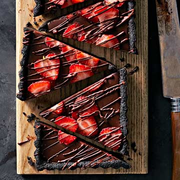 Pour chocolate mixture over crust and top with strawberries. Refrigerate 2 hours or overnight. Melt remaining milk chocolate and drizzle over tart.