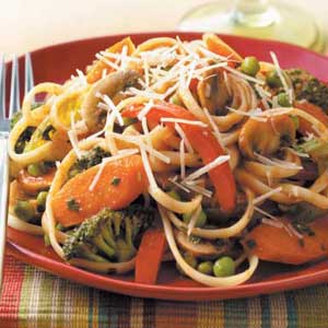 2. Drain fettuccine; add to vegetable mixture and toss to coat. Sprinkle with Parmesan cheese.