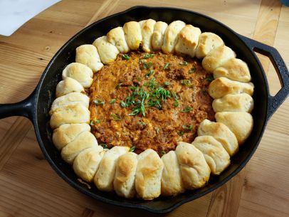 Golden brown garlicky biscuit bites encircles a delicious dip with taco seasoned ground beef, cheese and salsa in an iron skillet. The perfect appetizer presentation for your next get together. Enjoy!
