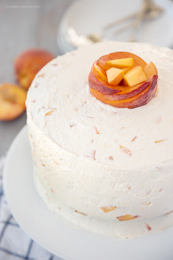 Place the first cake layer on your serving platter and frost just the top with the peach frosting (about ½" or so thick). Repeat with the next two layers, then frost the sides with an offset spatula (the long and skinny kind). Smooth top and sides until even, then top with sliced sliced fresh peaches for garnish, if desired.