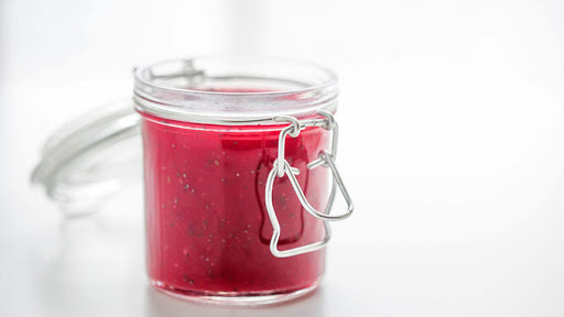 Fresh raspberries get a kick of flavor and color from pomegranate juice in this beautiful dressing. Serve with any salad that combines meat and fruit. Also great on top of grilled chicken or pork!