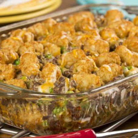 Place half the potato tots in baking dish, top with meat mixture, then remaining potato tops. Sprinkle with remaining cheese.