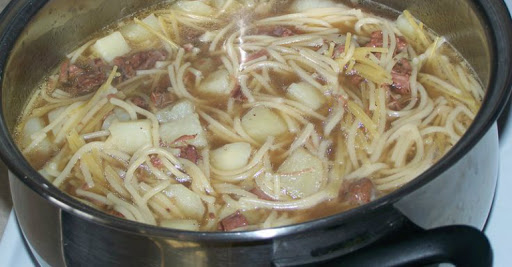 Cook potatoes, onions, and noodles together until done. Add beef or beef soup base to your taste.