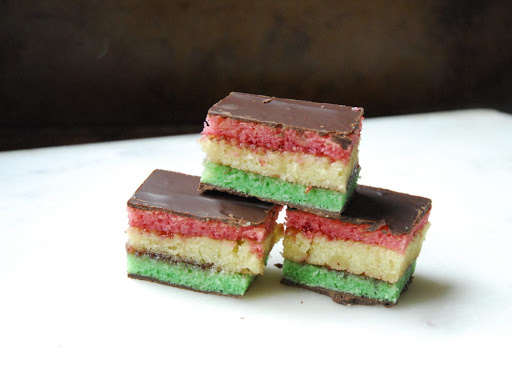3 thin multi colored cakes are stacked with a layer of chocolate ganache separating the layers and on top, then cut into cookies. Feel free to switch the food coloring colors up to showcase your event's theme. Enjoy!