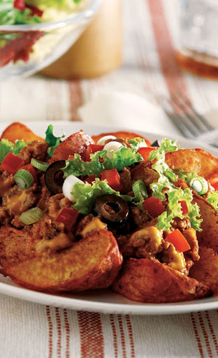 Remove the potato wedges from the oven and top with cooked turkey mixture. Garnish with mashed avocado, greek yogurt, green onion and cheese. Dig in with a fork and enjoy!