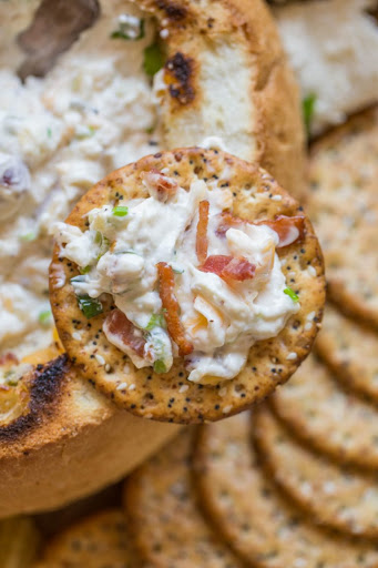 Top with 1/4 cup more cheddar cheese, and bake for 30 minutes. Add reserved bacon and green onions as a garnish, and serve with crackers, potato chips, and bread cubes.