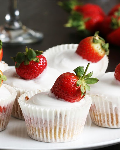 10. Poke several holes in each one and pour about 2 teaspoons of the strawberry champagne syrup on top, so that it seeps into the holes and is glistening on top.
