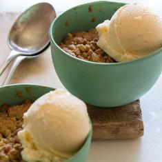 6. Place crisps onto a baking sheet and bake for 20 to 25 minutes or until golden brown. Allow crisps to cool for 7 to 10 minutes before serving each with a scoop of ice cream or a dollop of creme fraiche on top.