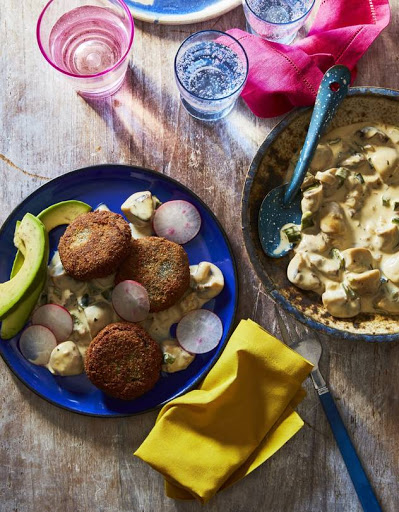Spoon mushroom sauce onto plates and top with patties. Serve with avocados and radishes.