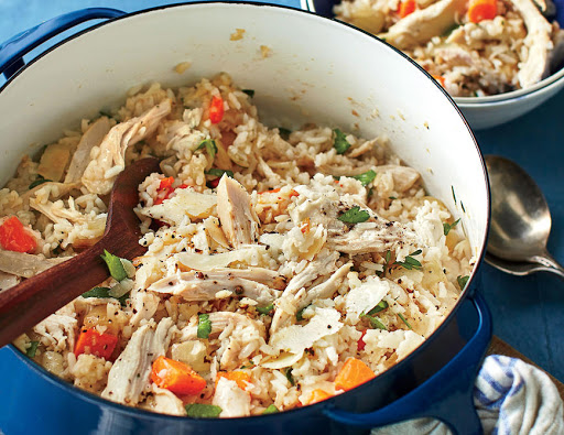 Stir in stock, and add Parmesan rind; bring to a boil. Reduce heat to low. Cover and simmer until rice is just cooked through, about 18 minutes. Uncover and discard rind; stir in chicken. Cook until chicken is heated through, about 5 minutes.
