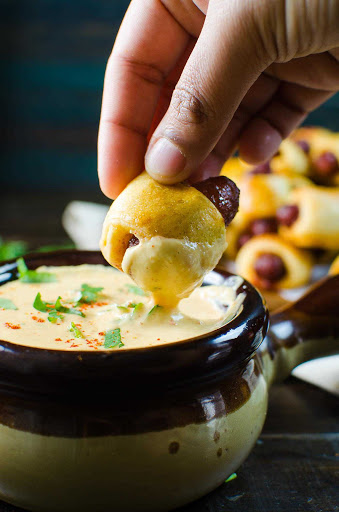 "Sweet and Spicy Pigs in a Blanket with a Spicy Cheese dip