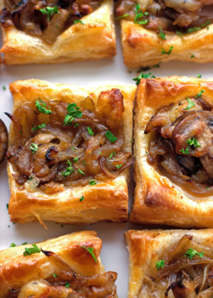 Using a knife or a pizza cutter, cut the puff pastry into 2-inch squares and place them on a lined baking sheet. Make sure the puff pastry is cold before proceeding. If not, allow it to rest in the refrigerator for 10-15 minutes before proceeding. Using a pastry brush, brush the beaten egg on the squares. Place a tablespoon of caramelized onion mixture in the center. Bake for 20-25 minutes, rotating the pan halfway in between until crisp and golden brown. Let cool slightly before serving.