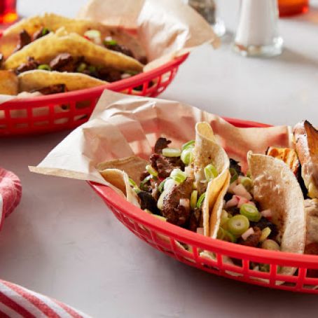 Tender slices of Mexican spiced beef, scallions, and serrano peppers are served in warm corn tortillas with a side of spicy sweet potato wedges which have been marinated in lime juice and sugar with a delicious layer of melted Monterey Jack cheese on top. This is the perfect dish to impress all of your family and friends. Serve this any night of the week for a zesty spin on your typical dinner rotation.