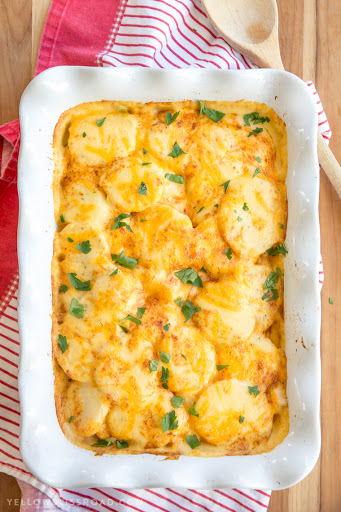potatoes overlapping in a single layer in the baking dish, seasoning with salt and pepper. Spoon about ⅓ of the cheese sauce on top of the potatoes.