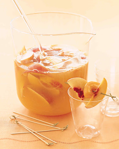 In a pitcher, combine peach, nectarine, and apricots, all pitted and cut into wedges. Stir in peach brandy; let sit at least 1 hour. Stir in Prosecco and peach nectar. Add superfine sugar, if desired. Serve chilled.