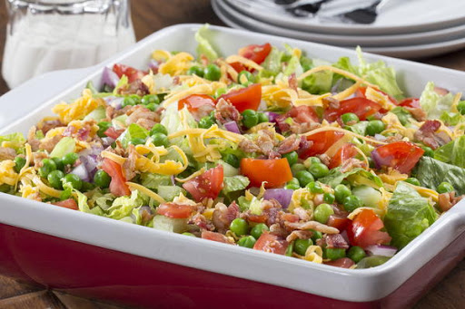In a 9- x 13-inch glass baking dish, layer half the lettuce, red pepper, celery, tomatoes, peas, onion, cheese, bacon, and dressing. Repeat layers once more. Serve or refrigerate until ready to serve.
